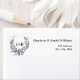 White background. Decorated with a lavender and eucalyptis wreath. Personalise and add your name, address. Add your first names initials. Black text.