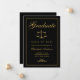 Send your family and friends an elegant graduation announcement featuring a black background with faux gold calligraphy and gold Scales of Justice bordered by a thin gold frame for law degrees. Personalise with your college graduation details. Designed by Susan Coffey.