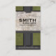 Copyright 2013 Pam's Designs. Promote your law career with this professional green, grey, beige, and grey rock texture with rectangular sections business card. This business card features a light beige and grey rock textured background with rectangular panels, making it look like an attorney's law office walls with wainscoting. This business card is well suited for attorneys, accountants, barristers, solicitors, financial planners, insurance brokers, stock brokers, publishing companies, printing companies, interior designers, dentists, librarians, and other professional and established careers.
