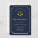 The design combines a structured scales of justice motif with an elegant ticket inspired border to frame the announcement while allowing the graduate photo to remain visible and balanced. Navy tones anchor the legal theme while gold accents add distinction without overpowering the content. This announcement coordinates with matching invitations, envelope liners, address labels and seals for a unified law graduation stationery suite.