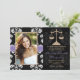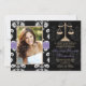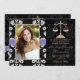Add your photo or favourite picture to these elegant and formal black and white floral damask law school graduation announcements and invitations with a gold scales of justice design and printed purple stitched ribbon look design. Customise it to say whatever you want on the back and front of the lawyer graduate graduation announcements and invitations. Artwork © Chrissy H. Studios, LLC. All rights Reserved.