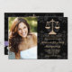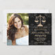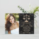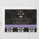 Add your photo or favourite picture to these elegant and formal black damask law school graduation announcements and invitations with a gold scales of justice design and printed purple stitched ribbon look design. Customise it to say whatever you want on the back and front of the lawyer graduate graduation announcements and invitations. Artwork © Chrissy H. Studios, LLC. All rights Reserved.