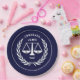 Law school grad party plates featuring creative scales-of-justice personified. To personalise edit text to add name of lawyer.