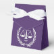 Humourous lawyer design featuring Scales of Justice personified on a purple background for law school graduation party or law firm celebration.