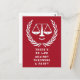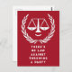 Creative lawyer party invites for law school graduation celebrations, law firm announcement, graduation announcement or birthday party featuring funny scales of justice on red background.