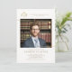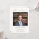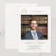 Celebrate your law school grad - or yourself - with this elegant, classic law school graduation photo invitation with a white and gold theme. Replace the scales of justice with the logo of your school or leave it as is. The contemporary typography design is elevated by the gold hues and the minimalist layout. Two gold lines (digital effect!) suggest a modern, minimalist frame for the photo. Customise every line of text. Navy and faux gold.