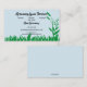 Are you starting up a lawn and garden care business? Then, this card is for you! It features a graphic of green grass and plants over a pale blue background. Everything on the front is editable.