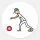 Lawn Bowls design shows a bowler in bowling gear and cap releasing a bowl toward the jack. The jack is not shown because it is miles away. Has one foot on the mat, a reasonable stance and the bowl will be true unless it is one of those crafty unbalanced ones.