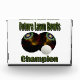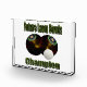 Pictured are two coloured lawn bowls with a jack and the words Future lawn bowls champion