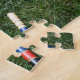 As fun as a game of croquet, this jigsaw puzzle is a challenge for all to enjoy. Three mallets and balls of primary colours, blue, yellow and red lie on a lush green grass lawn. Personalise withThe Family Name for all to join in the sunny outdoors sports puzzling, even indoors.