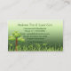 Customise the trendy business card for your lawn care, gardening or tree service company. The background is done in a green gradient with a tall tree on the left side. Bright green grass grows from the bottom of the design. Customise the text in your choice of fonts and colours.