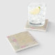 The coasters are gorgeous, a quality feel and heavy weight. They look like a precious archeological find. A rustic stone juxtaposed with a modern floral black and white print. I like the way the print goes slightly imperfect on the cut stone edges giving them a kind-of natural beauty.