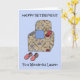 A cartoon, chintz covered armchair against a pastel blue background. There is a television remote control on one arm of the chair and a mug on the other. The words 'Happy Retirement to a Wonderful Lawyer' accompany the image.