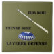 Depicts both the Tamir interceptor of Israel's Iron Dome missile defence system and a blue and white kippah (yarmulke). It takes both human effort and emunah (trust or faith in God) to keep Israel safe. Text reading "IRON DOME," "EMUNAH DOME," and "LAYERED DEFENSE" appear in a military stencil font.