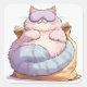Pure nap goals! This plump, fluffy cartoon cat is curled up in total comfort on a giant bag of crisps, perfectly capturing lazy-day energy. With pastel shades of pale pink, baby blue, and a shiny purple sleep mask pushed up on its forehead, this sleepy feline oozes smug satisfaction. The soft curves, bold lines, and gentle textures create a sticker-style illustration that’s both cosy and comical. Set against a clean white background for contrast, this design is a must-have for cat lovers and snack enthusiasts alike.