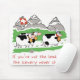 "If you're not the lead cow, the scenery never changes" Humourous cartoon cows parade through green pastures with edelweiss at the base of the Alps
