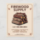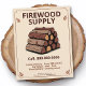 A rustic promotional flyer featuring a stack of split firewood logs and autumn leaves on a cream background in a frame.