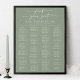Simple Elegant Leaf Green Alphabetical Wedding Seating Chart sign, with alphabetical seating arrangement - in beautiful handwriting script and your personalised text. A stylish yet simple formal design in any background colour you choose. Just click the edit using design tool link, shown under the text personalisation area on the right, and choose your custom colour background. This sign poster template makes it fast and easy to create stunning additions to your wedding decor. Signs can be enlarged, there are many sizes to choose from, as well as options for custom framing and matting. Welcome custom signage.