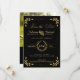 "Gold Laurel Leaf Greenery Black Save the Date Photo Engagement Announcement." Bold modern and elegant typography style 5 x 7 format in rich ebony black with gold glitter look leaf foliage corners and a laurel leaf wreath. Your engagement photo is easily changed out using the template field provided. Art and design by internationally licensed artist, Audrey Jeanne Roberts, copyright.