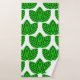 This towel set has a lime green washcloth, a green hand towel, and a bath towel with a Scandinavian design of leaf trios repeating across the design in three shades of green.
