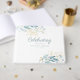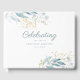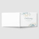 Elegant, green-blue-gold, leafy "Celebration of life" white Guest Book. Elegant, lovely handwriting font.