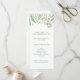 This trendy and stylish wedding program features a leafy green watercolor design and modern text.