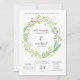 This trendy and stylish wedding invitation features a leafy green watercolor wreath and modern typography.