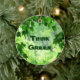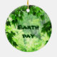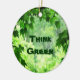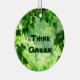 This Earth Day ornament invites you to enter a green leafy world of peace and serenity. Dark maple leaves frame the image, leading to a sunny woodland scene with shades of yellow, white and forest green. The message reads: Think Green. Customise the text to suit your needs.