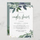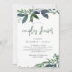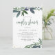 This modern botanical couples shower invitation features watercolor leaves in trendy shades of green, blue, and grey for a stylish look that is both minimalist and rustic.