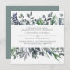 This modern botanical wedding invitation features watercolor leaves in trendy shades of green, blue, and grey for a stylish look that is both minimalist and rustic.