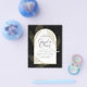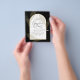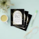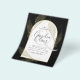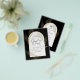 Introducing a softly formal black tie wedding item with black and gold colours adorned with delicate gold skeleton leaves overlaying the borders of an arched frame. This design is part of a coordinating collection and includes items such as RSVP cards, save the dates, invitations, welcome signs, stickers, napkins, programs, table number cards, favour bags, menus, and wine bottle labels, as well as a variety of card and paper types to fit any budget.
