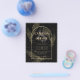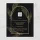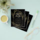 Introducing a softly formal black tie wedding item with black and gold colours adorned with delicate gold skeleton leaves overlaying the borders of an arched frame. This design is part of a coordinating collection and includes items such as RSVP cards, save the dates, invitations, welcome signs, stickers, napkins, programs, table number cards, favour bags, menus, and wine bottle labels, as well as a variety of card and paper types to fit any budget.