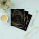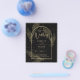 Introducing a softly formal black tie wedding item with black and gold colours adorned with delicate gold skeleton leaves overlaying the borders of an arched frame. This design is part of a coordinating collection and includes items such as RSVP cards, save the dates, invitations, welcome signs, stickers, napkins, programs, table number cards, favour bags, menus, and wine bottle labels, as well as a variety of card and paper types to fit any budget.