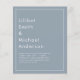 ⭐ Design by LeahG™ Founder of the Low Budget Wedding Network®. Congratulations on your engagement. 📌PIN this design to your wedding moodboard on Pinterest and enjoy your wedding planning journey. 🥰 Your friends and family will love this modern elegant dusty blue color themed wedding item. This is part of a collection that includes wedding invitations, save dates, rsvp cards, stickers, signs, photo overlay thank you cards and more. Prices start from 0.30. View the attached collection to see all the options ⭐ NOTE that paper weight and size reflects in the prices. For regular cardstock (5x7) use the TRANSFER option on your product page. Most of my designs include template fields on both sides (where allowed by the product) to ensure you get the most value and practical benefit. In the case of invitations, this enables you to include rsvp, gift registry, wedding website, reception details, and, in the most recent designs, a qr scanning code. For other items, you can add text or images as required for your event. Enjoy your wedding planning journey. ©Design and Text LeahG™