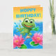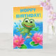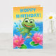 Leap Frog custom birthday card standard. One of my favorite illustrations. This little leaping frog loves birthdays and parties so much that he's jumping right out of the picture. Perfect for any kid's party ware, you'll find her on cards, invites and plates and various kids apparel. All with customisable ages and names for the perfect tailored party.