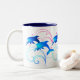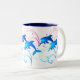 A pair of cute leaping dolphins play in the ocean, with pretty sunset sky in background, and stars.