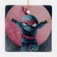 Warrior ninja wearing a dark blue outfit with a red headband and a red sash leaping through the clouds in front of a blood red moon on a in the dark night sky.