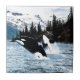 Two leaping killer whales before the untouched wilderness of the British Columbia coast. Originally in watercolor.