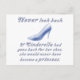 Never look back. If Cinderella had gone back for her shoe, she would never have become a princess. Live every day to the fullest, and never look back; no matter how bad something may appear, there is no telling what good may come of it. You only live once, don't waste time on regrets! A lovely design with glass-like writing, and of course, the iconic Cinderella's glass slipper.
