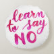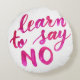 Learn to say no inspirational quote. Hand-written pink inspirational quote on round pillows.