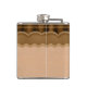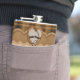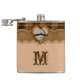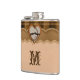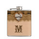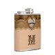 Western cowgirl themed drinking flask done in graphics of a tan leather look, with a brown decorative band, around the top, with a heart, on the middle of the front. Personalise the brown one letter monogram for yourself or as a great gift idea.