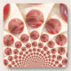 The artwork showcases a central cluster of red cricket balls that radiates outwards in a concentric, spiralling fashion. The balls vary in size, suggesting depth and perspective. The background is a soft, textured off-white, providing a subtle contrast that highlights the rich red of the cricket balls. The overall effect is visually engaging and creates a sense of organised yet dynamic movement.