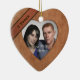 This heart-shaped ornament with a leather style print is perfect either for a 3rd wedding anniversary (which is traditionally celebrated with leather items) or any other occasion. Add your own photo to the heart frame and then on the back personalise it with a custom message. Although the text on the leather-look brown ribbon says '3 years' for those celebrating a third year of marriage, it can be changed to any other short text of your choice (such as 'I love you'). This design has a slight 3d look -- note that the ornament itself is a flat printed design.