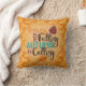 Orange autumn pillow with colourful leaves and text that says, "Leaves are falling. Autumn is calling."