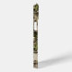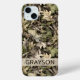Customize this leaves camouflage iPhone 15 plus case with your name in a trendy modern CAP font in brown on opaque cream. It's masculine and perfect for your favorite military, hunting, country or outdoorsman!