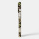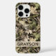 Customize this leaves camouflage iPhone 16 pro case with your name in a trendy modern CAP font in brown on opaque cream. It's masculine and perfect for your favorite military, hunting, country or outdoorsman!