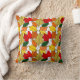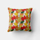 This throw pillow has a design of leaves repeating to make a pile of leaves in shades of yellow, red, orange, and green.