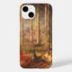 Rays of warm autumn sunlight glance through the yellow and red trees at the edge of the woods and brighten the fallen leaves on the forest floor. Deeper in the forest where the shadows are darker there are still glimpses of golden and crimson.
