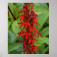 A cluster of bright red cardinal flowers stands tall against a backdrop of lush green leaves. The vibrant blooms are striking and eye-catching.