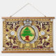 Lebanon (Arabic Lettering) Wall Art TAPESTRY -English lettering of the word "LEBANON" is displayed in a golden banner. . Includes the symbols of Humbaba, the ancient defender of the Cedar Forest with decorative Arabesques.